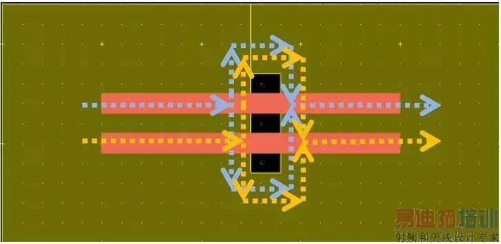 如果在传输线下面的地平面有一个开槽,就会导致电流回路的断开,如图2所示。电流回路断开会导致阻抗失配。这时候我们可以使用TDR仿真来检查阻抗失配情况,如图3所示,此外,当两条传输线的电流通路重叠(图4)的时候,两条传输线间的串扰就会被放大(图5),当我们需要给非理想回路的传输线建模的时候,可以考虑使用ADS Momentum EM solver,这是一个很有效的工具。