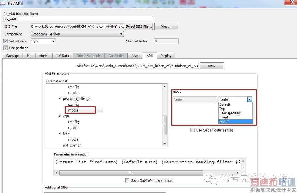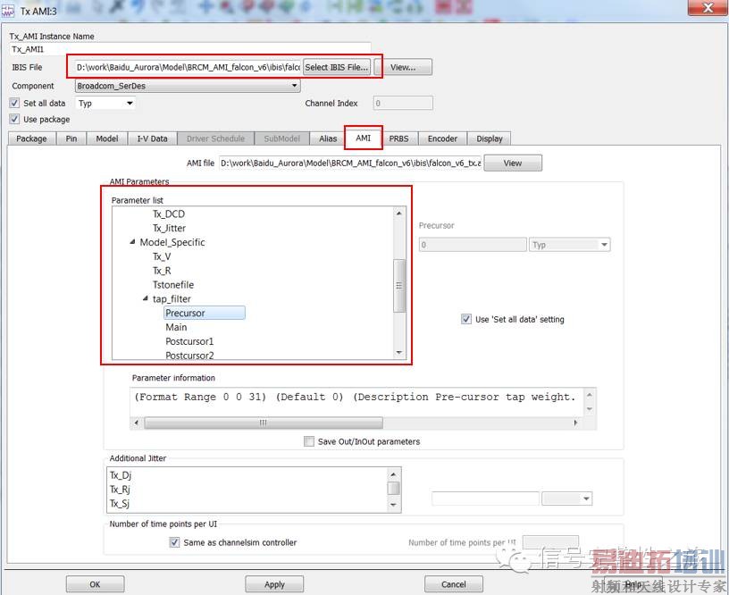 AMI: 设置AMI模型参数,此处是AMI仿真最重要的一步。Reserved Parameters: IBIS规范中定义的保留参数。Model Specific: 规范中没有的,自定义的模型参数,这里会有AMI模型中用于均衡调整的部分,比如上例中Precuror, Main, Postcursor都在这里设置。