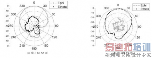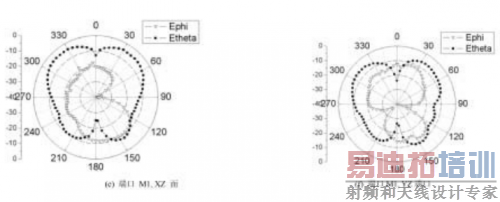 图4为各端口实测方向图。为了便于方向图的比较,所有的方向图都进行了相应的归一化。图(a)(b)为端口P1的XZ、YZ面方向图。从结果图中可知,在 XZ面内E_theta大于E_phi,而在YZ面内,E_phi大于Etheta,则说明端口P1辐射的电场平行于X轴。端口P2的XZ、YZ面方向图 为图(c)(d),也可以看出端口P2辐射的电场与Y轴平行。图(e)(f)所示为端口M1的XZ、YZ面方向图。从实测结果可以看出,无论在XZ面还是 YZ面,端口M1的E_theta都大于E_phi,说明端口M1的电场为平行于Z轴方向。可见天线有三个正交的极化模式。