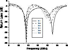 由于辐射方向图在同一开关状态下的两个谐振点的方向图基本对称,这里仅给出了该相控阵工作在状态I且频率为f=10.8GHz的辐射方向图。从该方向图可以看出,该相控阵工作在状态I且f=10.8GHz时能从-84o扫描到0o,根据对称性,如果该天线工作在该状态且f=13.5GHz时,则该相控阵能够实现从0o扫描到84o。同理,如果每个天线单元均取状态II的话则在f=10.8GHz时能够从0o扫描到84o,在f=13.5GHz时能够从-84o扫描到0o,也就是说,通过重构开关状态或者变化工作频率,该相控阵都能够实现从-84o扫描到84o的扫描,相对于普通的相控阵而言,该阵列极大地拓展了扫描范围。