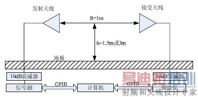 本校准方法需要三个相同类型的天线,也称作三天线法校准。校准原理如图1,将天线相互对准,确保两天线轴线在同一条直线上,并且极化匹配,两天线间的插入损耗与天线系数之间的关系可用公式1表示: