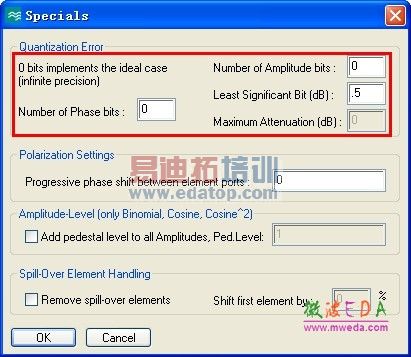 Maximum Attenuation(dB):最大衰减量 (不需要设置,当衰减器位数及衰减量最小步进设置完成后,此项会自动显示)。 注:移相器和衰减器位数设置为0时为理 想情况,位数无穷大(精度无穷高)。