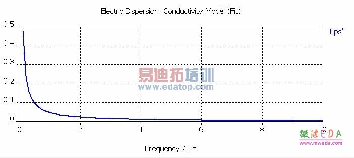 在弹出的相应对话框,输入频点及该频点上的损耗角正切值。这里输入的值符合f(x)=0.02/x 的分布,与电导率恒定比较符合,因此选择拟和方案为 Conductivity