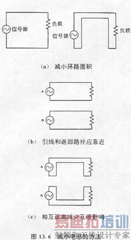 但是感抗与切割感应回路的寄生通量及感应电压相比通常小得多。回路面积必须被减到 最小,因为感应电压正比于回路面积。在线路接线使用双绞线时这一点很容易做到,见图13 .6(a)。