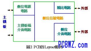 图2是典型的印刷电路基板Layout范例,如图所示该电路基板是复数个电路基板之中的一片,此时只要透过主机板就能够进行信号交易。主机板执行基板之间的数据交易时通常会有Bus通行,虽然图2的基板主体是数字电路,不过却混载小规模的模拟电路。