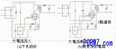 大电流流动部位会因pattern的直流阻抗发生电位差,此外类似方形波等站立极为快速的电流流动部位,会因电感(inductance)产生电位差,因此控制电路的common电位时,必需避免变化激烈的电流流入处理微小信号的电路pattern内。由图2(a)的电路图可知大电流会流入IC ground的pattern内,如果进行如图2(b)1点连接设计变更,大电流就不会流入IC ground的pattern内。
