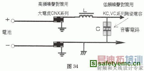 对于车载设备来说,与普通民用电气设备最大的不同是,车载设备的电源系统是由许多设备所共用的,设备与设备共处在一个相对狭小的车内环境中,因此设备与设备之间的相互干扰问题在一定程度上要比普通民用电气设备严重得多。在这个电源中,有普通的用电设备,如灯光控制、雨刮控制等等,也有车上的音响、电视、车载通信和车载导航等典型的电子设备,更有能产生强干扰的汽车点火系统等,这些负载的性质相差很大,有的是强干扰源,有的则是干扰敏感设备。为了确保各种设备都能很好地工作,对每一个设备的电源进线进行必要的处理是不可缺少的,图34就是有关车载音响设备的电源线处理例子。图中采用MARUWA公司的片式大电流三端电容、片式两端电容和普通电感组成的电源线滤波环节。