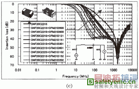 图33是将MARUWA公司的磁珠与三端电容器结合起来使用的例子。其中图(a)是单个磁珠的插入损耗,图(b)是单个三端电容的插入损耗。从图中可以看出,两种器件单独使用时的插入损耗曲线都不是非常陡直,说明噪声衰减的选择性比较差;与此同时,插入损耗的最大衰减也不是很大,说明对噪声的衰减能力有限。从图(c)至图(h)给出了将磁珠与三端电容器合在一起使用的插入损耗曲线。其中图(c)至图(f)是220pF、470pF、1000pF和2200pF四种电容分别配60Ω至2000Ω磁珠时得到的插入损耗曲线。而图(g)和图(h)是磁珠固定,分别是150Ω和2000Ω配不同电容时(220pF、470pF、1000pF和2200pF四种电容)得到的插入损耗曲线。从曲线的形状与最大衰减值来看,都要比单个元件使用有较大改进。