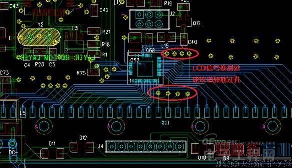点评:上图圈示的是LCD信号走线,LCD信号属于敏感信号,图中信号走线跨分割。建议在相邻层保证完整的地平面供其回流,以减少回路面积,保证良好的抗干扰性能。