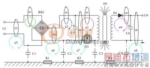 传导干扰分差模干扰DI和共模干扰CI两种。先来看看传导干扰是怎么产生的。如图1所示,回路电流产生传导干扰。这里面有好几个回路电流,我们可以把每个回路都看成是一个感应线圈,或变压器线圈的初、次级,当某个回路中有电流流过时,另外一个回路中就会产生感应电动势,从而产生干扰。减少干扰的最有效方法就是尽量减少每个回路的有效面积。