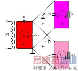 下面以图7示意,对电流回路辐射进行详解。如图,S1为整流输出滤波回路,C1为储能滤波电容,i1为回路高频电流,此电流在所有的电流回路中最大,其产生的磁场干扰也最严重,应尽量减小S1的面积。