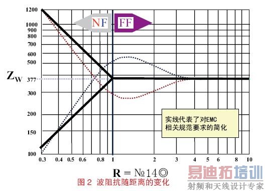 在靠近源的区域,电场和磁场的关系非常复杂;尽管既有电场又有磁场,但该区域要么基本体现为电场要么基本体现为磁场。在远离源的区域,电场和磁场的关系变得稳定了,即E/H=120π。电场和磁场的这种关系如图2 所示。EMC从业者通常采用简化和近似的距离,即R=λ/2π,并认为场在该处出现从近场到远场转变。这个公式的前提假设是源结构的尺寸小于半个波长。天线的设计者们所寻求的更加精确的表达式可能会成为上述观点的一个例外情况。 [p]