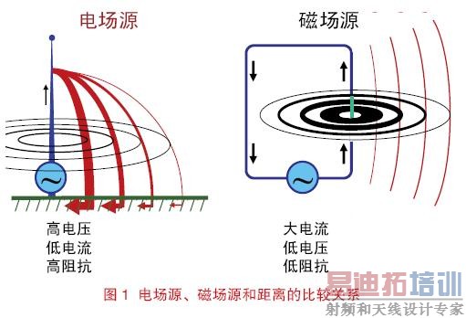 如果电荷作加速或减速运动或者电流增大或减小,就会产生变化的磁场。如此一来就会产生变化的电场,源就会辐射出电磁能量了。电磁能量既可以产生于高阻抗的电场源(高电压-小电流)也可以产生于低阻抗的磁场源(大电流-低电压)。如图1 所示的单极天线和环天线就是这两种源的典型代表。
