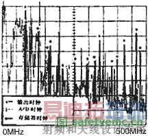图2是液晶监视器的从0MHz到1000MHz的辐射频谱。在这次测量中,输出时钟工作在42.5MHz,模数转换时钟运行在78MHz,存储时钟运行在80MHz。