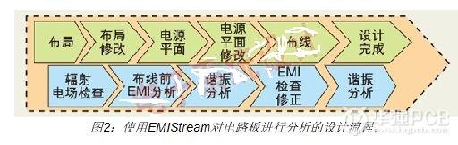 图2是使用EMIStream对电路板进行分析的设计流程。EMIStream嵌入在PCB设计的全过程,在设计阶段解决EMI问题有利于减少反复设计的次数。
