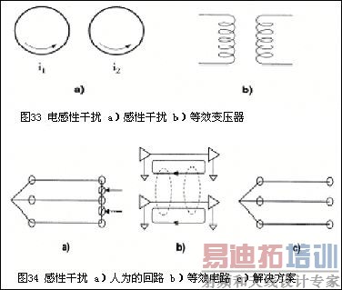 电感性干扰可以被看作是一个多余的变压器(transformer)的初级线圈和次级线圈产生的耦合信号(图 33) 。变压器的线圈是PCB板子上(或者系统里的)电流回路。这线圈可能是由于不恰当的设计人为造成的(图34a), 也可能是信号线与信号回路组合自然造成的。(图34b) 。人为造成的线圈时常难以定位,但是可以被排除(图 34c)。