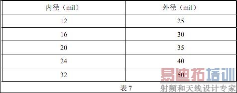 标准导通孔尺寸(孔径与板厚比≦1:6)如表 7: