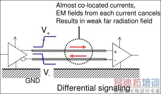 而差分讯号所产生的磁场,会彼此相消,所产生的电场,会因彼此紧密地耦合在一起,进而减少发散向外的机会[8-10]。