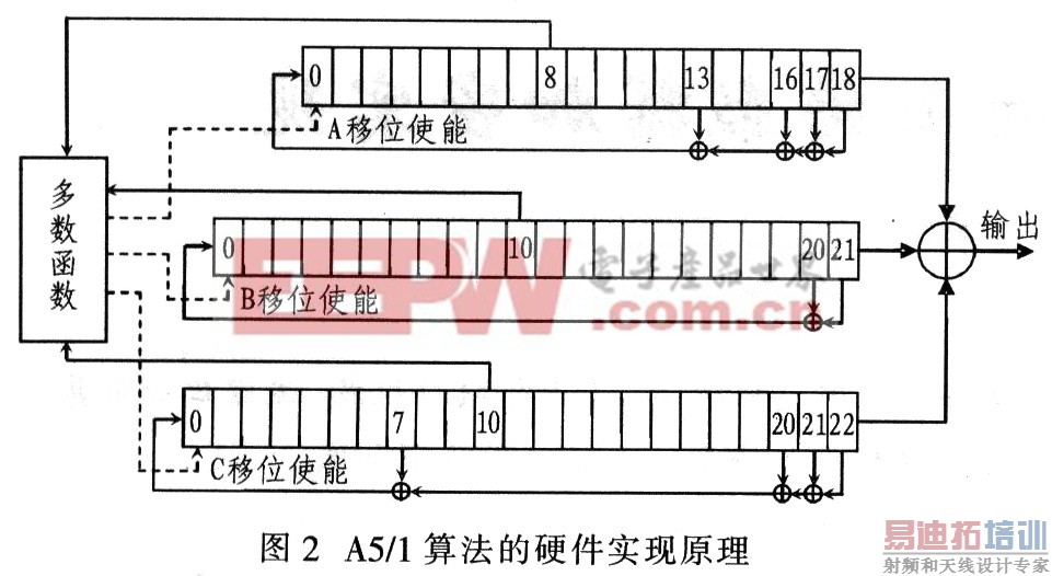 A5/1引是GSM移动通信中数据传输的流密码加密算法。A5/1密码流产生器生成的密码与明文数据帧的每一位相异或得到密文序列。A5/1算法由3个不同长度的线性反馈移位寄存器R1,R2,R3组成,其长度分别为19,22,23位,其反馈特征方程分别为:x18+x17+x16+x13+1,x22+x21+x20+x7+1。算法的初始密钥是64位向量。密码流输出位为3个移位寄存器的异或输出。移位寄存器的使能由多数函数控制。Rl的第8位、R2的第10位、R3的第10位为多数函数数据输入,它们决定3个移位寄存器的移位状况。在这3个数据位中,如果有两个或两个以上的都为0,多数函数值就为0;如果有两个或两个以上的都为1,多数函数值就为1。多数函数输入的3个数据位中与多数函数值相同,相应的移位寄存器就移位。A5/1的硬件实现原理如图2所示。密码流的产生分两个阶段.第一阶段给寄存器装人64位初始值;第二阶段则根据时钟节拍和使能控制产生密码流。