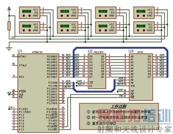 如图3所示,在本实例中以单片机AT89C52和8个DS18B20构成了一个多点测温系统。为了有足够的空间存储各个DS18B20的ROM编码和温度值,在实例中用一片8KB的SRAM芯片6116对单片机的RAM进行了扩展。