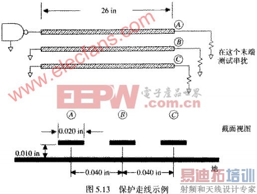 图5.13举例说明了保护走线的典型应用。驱动器沿着走线A传输一个已知的电压阶跃,在走线B或走线C上可以接收到由这一信号引走的串扰。走线是26IN长,特性阻抗是50Ω。