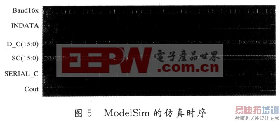 当完成设计输入后,就需要对所设计的算法进行时序仿真,验证算法的正确性。图5的时序图是采用ModelSim对C码的扩频模块spreadC_part、扩频的并行输出模块Baud_parr、串行输出模块serial_out以及并行解扩模块receiveC_parr所进行的仿真时序。如图5所示,Baud16x是一个1.024 MHz的时钟,INDATA是速率为64 Kb/s的输入码元、D C(15:0)为spreadC_part模块输出的扩频数据。注意到此时的D_c(15:0)为总线结构的16位数据,速率为Baud16x/8=128 Kb/s,在空闲时刻输出的都是0,这个数据输入到Baud_parr模块和seriaI_out模块。SC(15:0)和SERIAL_C分别对应这两个模块的并行输出和串行输出。可以看出SC(15:0)是16位总线数据,速率为1.024 Mb/s,SERIAL_C的串行数据速率也为1.024.Mb/s。Cout为将SC(15:0)的并行数据解扩后恢复出来的码元,可以看出,Cout正确地恢复出了IN-DATA的码元。