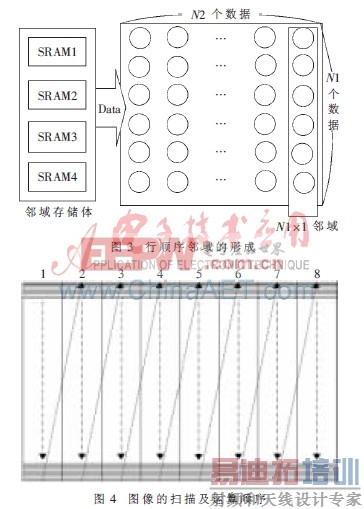 邻域图像并行处理机是一种以邻域图像帧存提供邻域图像数据、以邻域图像处理器并行邻域图像处理的图像并行处理机,其本质是邻域数据(即多数据)的并行处理[4]。中值滤波系统框图如图2所示,主机通过PCI接口将待处理数据写入共享RAM,数据再由共享RAM转入邻域存储体,利用行顺序邻域生成方法[3],将数据由串行转化为并行,实现处理并行,达到数据的高速处理。邻域存储体是由4片SRAM组成,型号是IS61SP6464,位宽为64 bit,一次可以存取8个字节,4片SRAM并行排列,一个时钟周期最多可以吞吐32个字节。见图3,考虑一个N1×1的随机邻域,N2个时钟周期就可以得到N1×N2大小的邻域。然后再将中值滤波模块结果通过FIFO缓存写入共享RAM,传到PC机显示。
