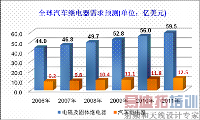 根据美国风险发展公司(VentureDe-velopmentCorporation)2007年8月份对全球电磁及固体继电器市场的调查报告显示,目前汽车继电器的销售额约占全球电磁及固体继电器总销售额的21%,并且汽车行业已超过通信行业,成为继电器的第一大应用领域市场。同时统计数据还显示,2006年全球电磁及固体继电器销售额达44亿美元,其中汽车继电器销售额为9.2亿美元。预计到2011年全球电磁及固体继电器销售额将达59.5亿美元。其中汽车继电器销售额将为12.5亿美元,年均增幅将达6.2%。2007年在汽车的总制造成本中,约有22%是来自汽车电子电器,预计到2010年这一比例将有可能达到 30%~40%。