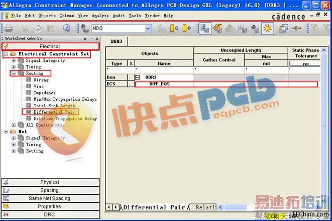 在 Electrical CSet 编辑框输入差分信号规则名称,这时在右边的工作表中可以看到多了一个DIFF_DQS 的约束规则,如下图1-3所示