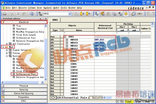 设置好差分信号约束规则后,将该约束规则应用于差分信号上,点击左边的工作表选择区中的Electrical 工作表下的 net 下routing,在右边的工作表找到所建的差分信号,在 referenced Electrical CSet 选择刚才设置好的差分信号约束规则 DIFF_DQS,如下图1-5所示。
