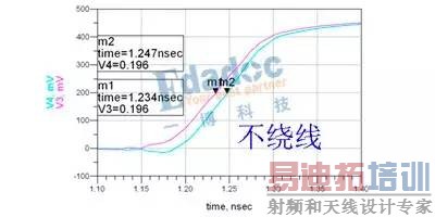 可以看到,小波浪绕线等长基本上就等时了,而原本不绕线时,蓝色比红色传输时间长13ps,大波浪绕线之后蓝色的传输延时反而比红色的快了,并且整体的传输延时加大了。这里的电磁场分布比较复杂,大家可以看到其实不绕线以及大波浪绕线N与P的上升时间其实都不一样了,之后讲S参数时大家可以在各谐波的相位上看到更明显的区别。