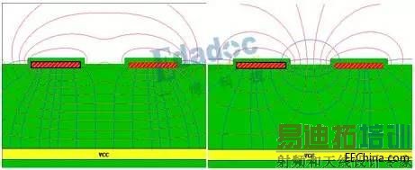 当波浪两边较近的时候,走线的C是增大的,而L是变小的,到这里我们并没有办法分辨出传输速度是变快还是变慢。表层微带线由于走线下方是介质,介电常数为4.2;上方是空气,介电常数是1。两线靠近时,更多的电力线分布在空气中,感受到的介电常数变小,所以传输速度变快了。