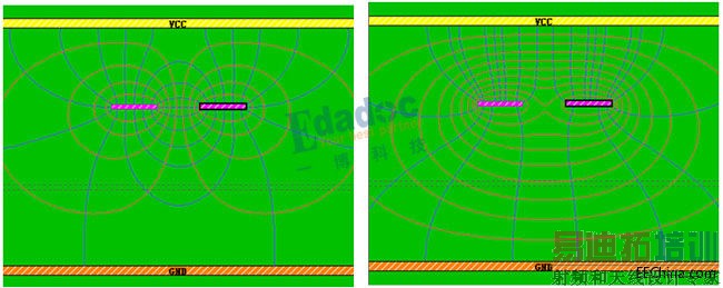 电磁场分布也是明显的不一样呢,那是不是带状线也要避免大波浪绕线导致的自耦合呢?很遗憾的告诉大家,并不是这样的。在理想的带状线中,两边的介电常数是不变的,无论电磁场如何分布,感受到的介电常数都一样,所以传输速度并不会发生变化。