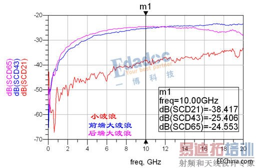 虽然看起来小波浪会好一些,但是大波浪绕线的SCD21明显也在-25dB以内,两线之间的延时差也小于4ps。明显比微带线的情况要好。