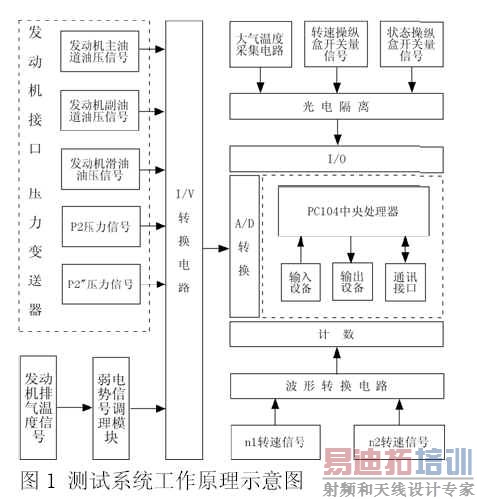 工作时,通过电缆连接发动机上的转速、压力、温度信号测试接头,信号经过调理、A/D转换、计数等操作被采集到计算机系统,结合高速数字I/O测得的状态电门信号,可实现对发动机所处状态的判断,进而完成参数的计算和性能的测试,并实现各类信息的指示和数据存档。