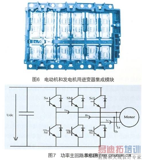 在 Prius THS Ⅱ主驱动系统中,电动机和发电机所用三相电压型逆变器(功率分别为 50kW 和 30kW )被集成一个模块上(如图 6 所示,逆变器的电气结构图如图 7 所示),直流母线最大供电电压被设定为 500V 。功率器件选用带有反并联续流二极管的商用 IGBT ( 850V/200A ),该功率等级的 IGBT 具有足以承受最大 500V 反压的能力,以及其它诸如雪崩击穿、瞬时短路的能力。