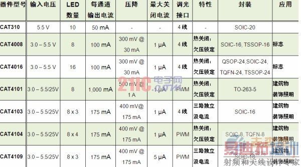 CAT4103和CAT4109是安森美半导体恒流低压降驱动器(LDO)产品线的两款产品,这产品线还包括CAT4101和CAT4104等,其中,CAT4101提供高精度的1 A电流驱动能力,而CAT4104是一款四通道的恒流LED驱动器,适合通用及建筑物照明、汽车照明、LCD背光等应用。