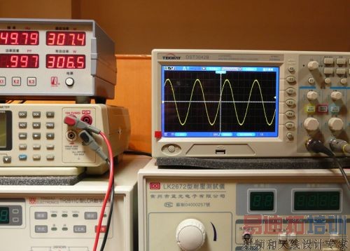 把前级的DC-DC驱动板重新插上,后级AC输出端的负载去掉,接上示波器(示波器最好用1:100的高压探头)和万用表(AC700V档),把高压保险丝换成一个0.5A的。下面要做的事是:开机!即按一下DC-DC驱动板的启动开关,成败在此一举,如果后级元件耐压没有问题,此时,应该在示波器上看到正弦波了,波形应该很漂亮。这里,调整SPWM驱动板的多圈电位器R7,就可以看到输出电压在变化,把它调在225V左右停下。