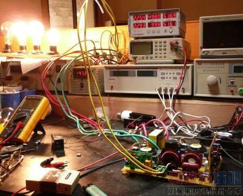 这里,可以稍稍为前级加点负载,可以用二个100W220V的灯泡串联起来,接到高压解的二端,这时电瓶电流可达到12A左右,让它工作一段时间,看看前级功率管有没有温升,如果温升不明显,可以把电瓶保险丝换大点,继续加大负载,一般在功率管散热正常的情况下,前级可以加到600W左右。在加载的情况下,再看D极波形,应该是正常的方波,稍有点尖峰是没有关系的,如果尖峰过大,说明变压器制作不过关,要重新绕制。
