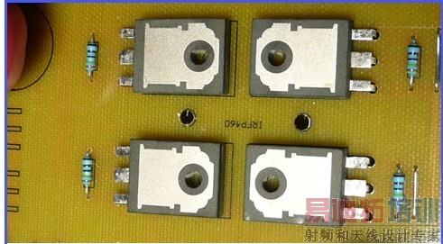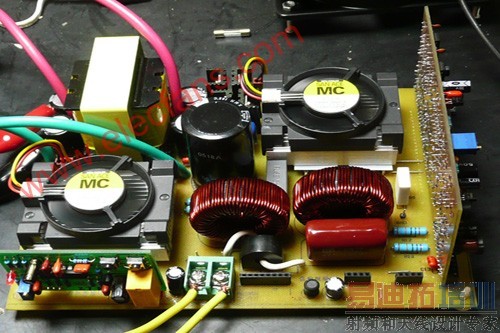 本机前级功率管和H桥的功率管都用风扇散热(安装方法下面再详述),这是一种小型仪表风扇,比电脑上的CPU风扇还要小一点,实验证明,在600W输出的情况下,H桥的4个功率管散热不成问题,但前级的二个功率管好象散热不够一点,如果有可能,最好用大一点的风扇。