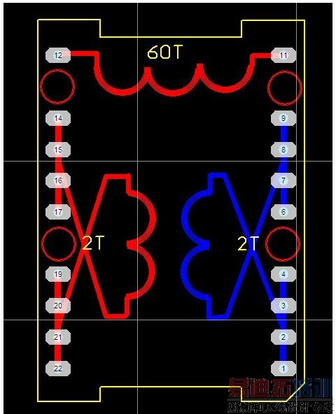 先准备骨架,把骨架上22个引脚,剪去4个,下面红圈处就是表示已经剪去的脚。上面二个独立的脚是高压绕组用的,远离下面的脚有利于绝缘,中间及下面的脚是低压绕组用的,左边是一个绕组2圈,右边是另一个绕组2圈。