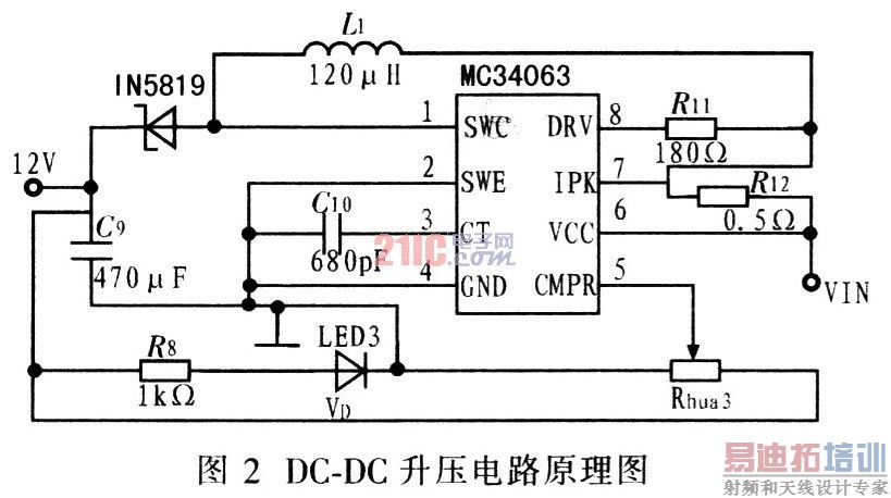 根据智能车的设计需求,需提供5 V电源为单片机、SD卡、测速模块、PCB板上电路、无线通讯模块等供电:6 V电源供给舵机,CCD摄像头需12 V的工作电压。其中的难点是12 V DC-DC升压电路。这里使用MC34063A搭建由7.2 V升压到12 V的升压电路。MC34063A是单片双极型线性集成电路,专用于直流一直流变换器控制,内置占空比周期控制振荡器、驱动器和大电流输出开关,可输出1.5 A的开关电流。它能使用最少的外接元件构成开关式升压变换器,降压式变换器和电源反向器。图2为DC-DC升压电路原理图。