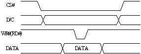 只要按照VGG12864G的时序波形图进行读和写,即可完成OLED的显示。但是,通过软件编程拼时序的话,要考虑到许多时间参数,有一定的难度。为了使得数据和命令能够更容易的顺利读写,我们采用另外一种办法。如图1所示,将WR#和RD#分别接C8051F023的/WR和/RD,即P0.7和P0.6。在C语言编程时定义指针类型为xdata型,它是指向片外存储器的,通过给指针的赋值访问片外的数据存储区,当访问片外存储器时,/RD和/WR会在读和写时自动变低,同时P3端口为数据总线,非复用方式下,地址总线的高8位使用P1口,低8位使用P2口;复用方式下,地址总线高8位仍使用P1口,低8位和数据总线复用P3口,P2口就不会受到影响。所以最好设置成复用方式(EMIOCF.4=0),P2口就可以用来作别的输出端口,自由地控制RES#、CS#、DC。虽然不需要地址总线,但访问片外存储器时地址线会被使用,所以仍要避开。实验结果的时序波形图如图3所示。只要CS#为低时,在WR#(RD#)的下降沿写入(读出)数据或命令,即可有效地完成读写的工作。