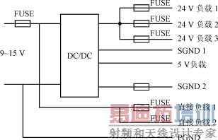 本文提到的多路输出军用车载电源是一种输入输出均为低压大电流的双路DC/DC开关电源。输入电压9~15V,输出电压2路:一路24V;一路5V。24V输出又同时供给三路负载;输入电压又直接供给两路负载,如图1所示。