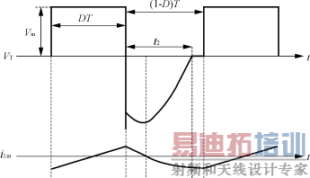 (4)阶段4〔 t 3~ t 4〕 激磁电流下降到零之后,二极管D就截止。但是, C 2上的能量又会回馈给激磁电感,也就是说,此时是 C 2和激磁电感发生谐振。 C 2上电压下降,激磁电流反向增加。直到 C 2上电压下降到与输入电压相等,也就是变压器上电压下降到零,该状态结束。