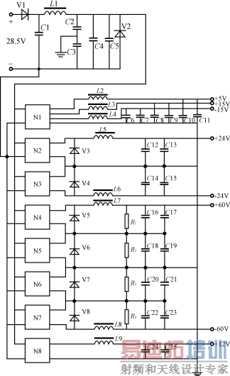 (2)±24V(2A)选用两块美国生产的VICOR电源模块MI睯23睲X/S,该模块输出24V(3.1A),工作温度-55℃~+100℃,外形尺寸为57.9mm×45.7mm×12.7mm,其性能满足设计要求。 [p]