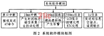采用实时操作系统,即定时器T0产生10 ms中断,利用10 ms中断计数分别产生200 ms、500 ms和1 s任务。系统软件模块框图如图2所示。 [p]