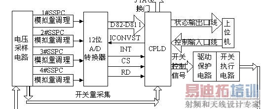 如图1所示,每路SSPC取样电阻上的电压经过调理电路和低通滤波器以后,送到4通道A/D转换器的一个模拟输入端,A/D转换器的数据输出端、状态信号和控制信号分别接到CPLD的 I/O引脚,便于程序控制A/D转换器的动作。CPLD另外的I/O口可以配置为MOSFET的开关命令输出口线、SSPC的状态输出口线和与上位机相连的控制命令输入口线;CPLD自身提供的JTAG BST电路,可以方便的测试系统内部器件之间的连接和检验器件的操作。