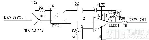 控制命令经过光耦隔离输出后,接到比较器LM311的正相输入端,比较器的反相输入端输入的是参考电平Vref,取 Vref=3V。当DRV_SSPC1=1时,光耦输出高电平,比较器正相输入端电压大于反相输入端电压,比较器输出DRC_OUT为高电平:当 DRV_SSPC1=0时,光耦输出低电平,比较器正相输入端电压小于反相输入端电压,比较器输出DRC_OUT为低电平;比较器的输出端接低值电阻 R30,目的是与电力MOSFET的G极和D极间寄生电容构成一定时间的阻容延时,保证MOS管的导通时间不至于太快或太慢,减小寄生振荡,该电阻值应随被驱动器件额定电流值的增大而减小。