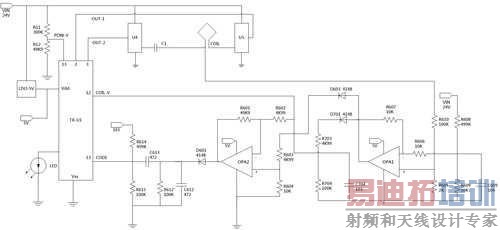 在图4中由两个运算放大器OPA1、OPA2构成两个差动放大电路,其OPA1动作为由R608与R609进行分压驱动电源作为差动参考点;另外,由R610与R605对线圈谐振讯号进行分压作为放大讯号输入,在此有一配置为R608、R609与R610、R605之分压比例皆为50比1,其用意在于取出与电源驱动电压与谐振讯号中开关电压失真相等后,透过差动放大出谐振讯号高于电源驱动电之成分进行放大。